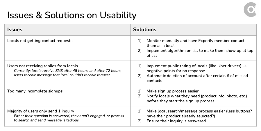 Through looking at the analytics, user flow, and the step-by-step evaluation I performed, I listed out possible opportunities for improvement — both in terms of UI usability and the bigger concept of Experify's product.