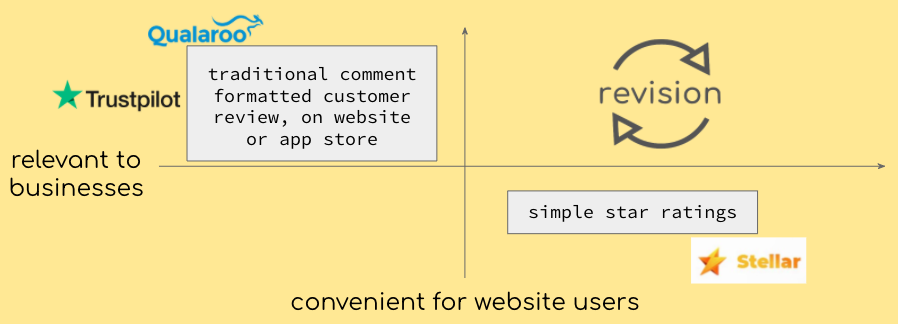 With what we learned from user interviews, we researched the market and competition, focusing on tools and services for collecting customer reviews. There were platforms that focused on making feedback easy to collect, such as star ratings or number ratings. Meanwhile, there were others that made sure feedback was relevant to businesses, usually in the form of surveys and text comment boxes. Here, we saw a hole in the market for customer review tools that combined the two, convenience for website users and relevance for businesses implementing the feedback.
