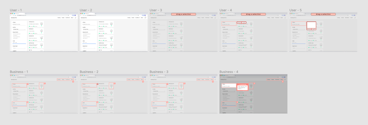 Next, I created and refined the prototype on Figma, one of the view that website users would interact with, and another that the business and website managers would see.